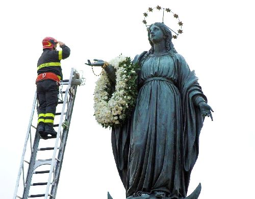 No dia 8 de dezembro, na Piazza di Spagna, a coluna da Imaculada Conceição é especialmente adornada pelos fiéis (acima). Logo pela manhã desse mesmo dia, os bombeiros colocam uma coroa de flores no braço da imagem, que permanece até a mesma festa no ano seguinte (fotos abaixo)